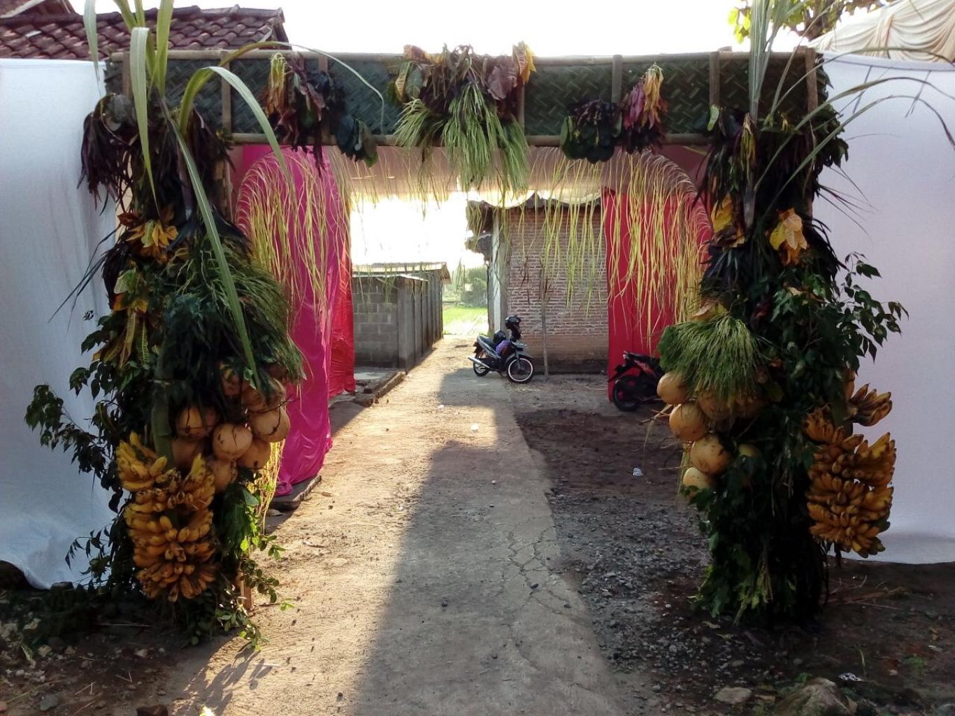 infoPleret- Sejumlah sanak saudara keluarga Bapak Waluyo mulai memasang tarub, Jum'at (13/04). Pemasangan Tarub ini sebagai tanda hajatan telah dimulai. Untuk perlengkapan tarub selain janur kuning masih ada lagi di antaranya pisang raja, kelapa gading (cengkir gading), padi yang sudah tua, batang pohon tebu wulung (tebu hitam), dan daun beringin. Menurut budaya Jawa, pisang raja berarti kemuliaan untuk kedua mempelai. Kelapa gading atau cengkir berarti tekad bulat baik dari pasangan perempuan dan pria untuk membentuk keluarga bahagia. Sedangkan janur kuning bermakna Sejatine Ning Nur yang artinya untuk mendapatkan hasil semua itu harus mendapatkan cahaya Ilahi. Tarub itu juga simbol harapan supaya para tamu mendapatkan naungan serta kesejahteraan, terlindungi dari panas dan hujan serta hajatan dapat berjalan baik.